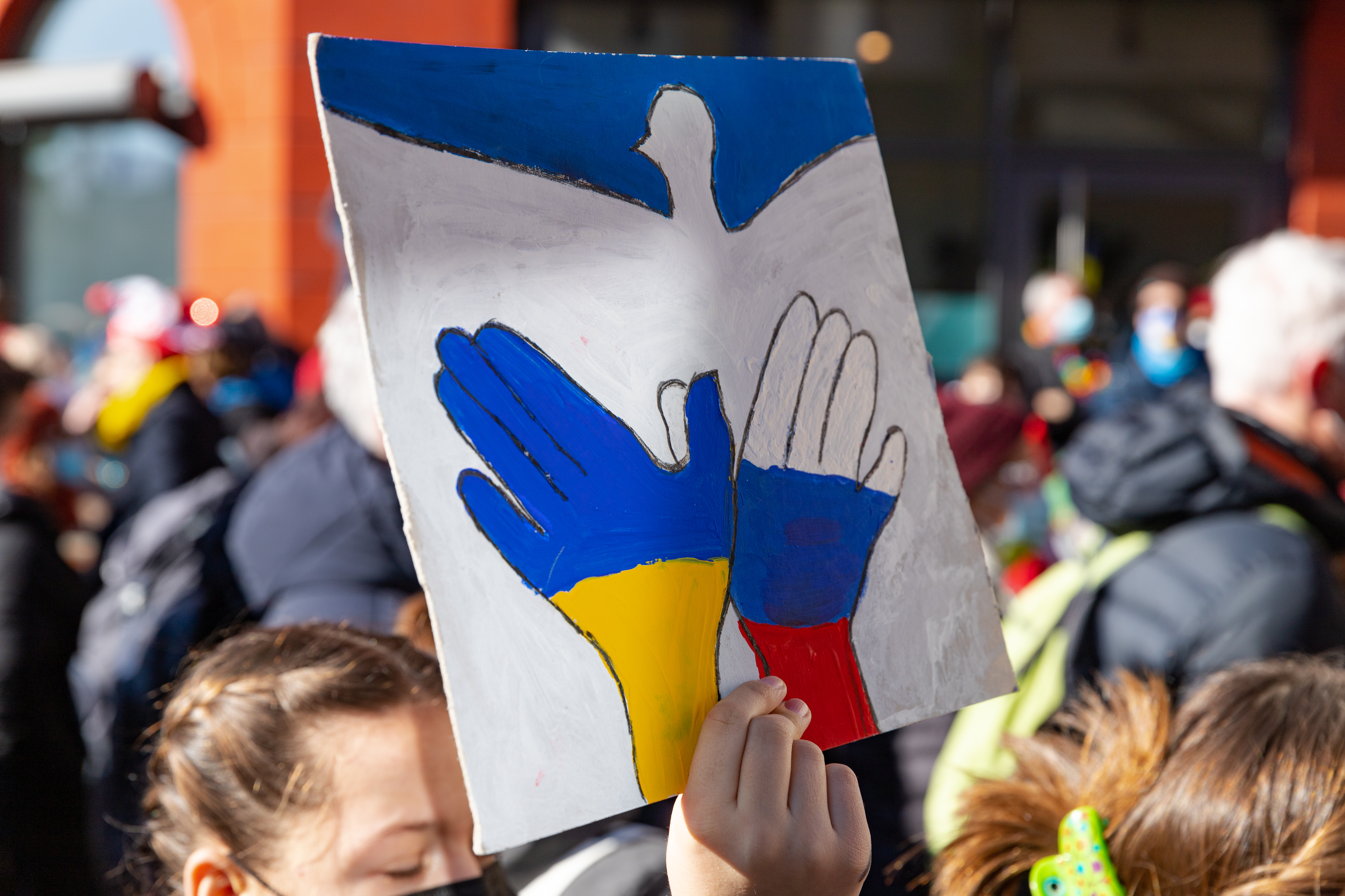 Bildquelle: dronepicr, https://www.flickr.com/people/132646954@N02, https://commons.wikimedia.org/wiki/File:Protest_sign_with_a_white_dove_and_the_flags_of_Russia_and_Ukraine_in_Cologne,_Germany_(52759610736).jpg